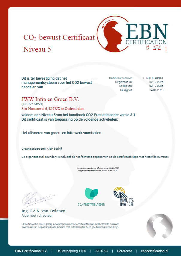 Sinds januari 2022 ben ik bezig met de certificering voor de CO2 prestatieladder trede 5, de hoogste trede op de CO2prestatieladder. Ik ben in de afgelopen 25 jaar in principe altijd al actief bezig met de reductie van COuitstoot door mijn bedrijf. Al jarenlang stel ik al ambitieuze doelen. Door ambitie en innovatie samen te voegen lukt het daarom nu om in 1 keer van trede 0 naar trede 5 te klimmen. Door nieuwe machines te ontwikkelen, waarmee het werk veelvoudig sneller gaat, de transport nagenoeg wegvalt, grond recyclen op het werk; oftewel: bij elk werk wordt nagedacht wat de efficiëntste en slimste aanpak is.